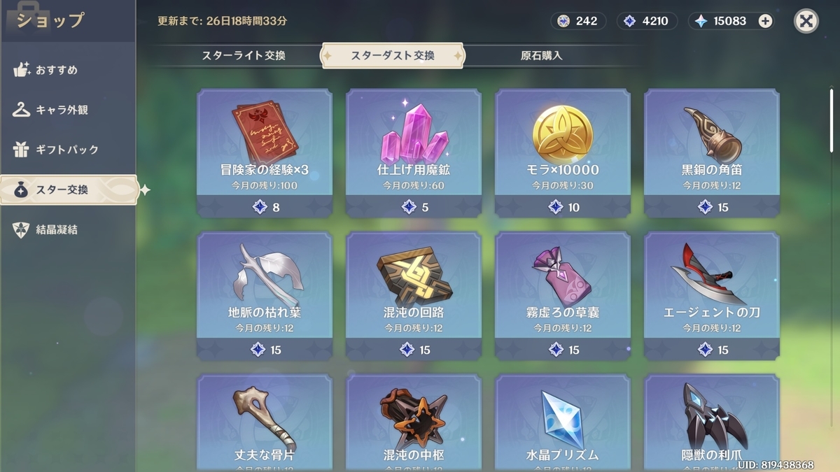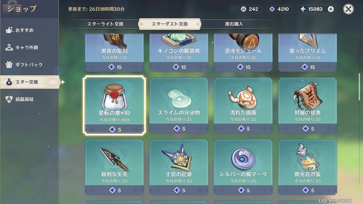 ガチャ石、経験値本、魔鉱、モラ、変転の塵、素材と交換できます